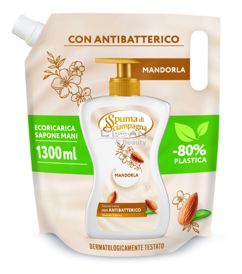 Spuma di Sciampagna Sapone Crema Mandorla Ecoricarica е създаден за тези, които търсят нежна, подхранваща грижа за ръцете и едновременно устойчиво потребление. С кремообразна текстура и аромат на бадем, този течен сапун е идеален за цялото семейство.
