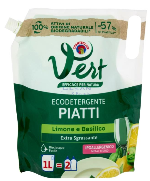 Chante Clair Piatti Limone & Basilico е високоефективен италиански препарат за измиване на съдове, формулиран с биоразградими съставки и натурални аромати. Съчетава почистващата сила на лимона с антисептичните свойства на босилека, осигурявайки изключителна чистота и блясък. Създаден да се справя дори с мазни остатъци при ниска температура на водата, като едновременно поддържа ръцете гладки и хидратирани. Подходящ за ежедневно използване.
