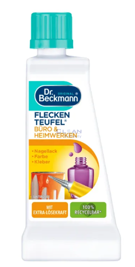 Dr. Beckmann Fleckenteufel Nagellack & Klebstoff 50 мл е мощен препарат, предназначен за отстраняване на упорити петна от лак за нокти, лепила (вкл. моментно лепило), смоли, коректор, гумички и строителни смеси. Формулата е базирана на специален разтворителен комплекс, който разтваря петната, без да уврежда тъканите или цветовете. Изключително подходящ за цветни и бели дрехи от памук, синтетика и смесени материи. Препоръчва се за домакинства и професионална употреба в Западна Европа, където надеждното премахване на трудни петна е приоритет.