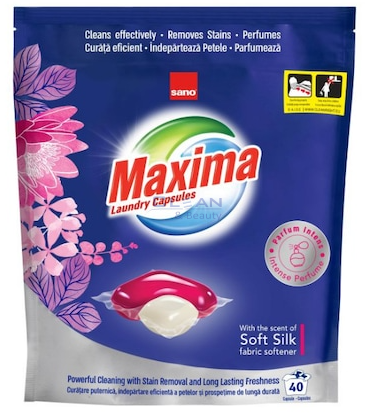 Sano Maxima Soft Silk гел капсули осигуряват безупречно чисто пране и дълготраен нежен аромат. Удобната 3-в-1 формула премахва петна, запазва цветовете и омекотява тъканите. Погледнете детайлното описание.