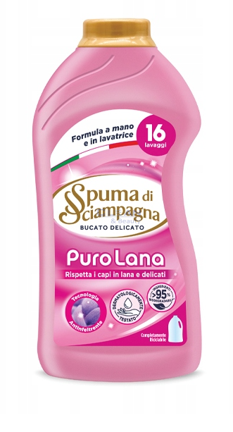 SPUMA DI SCIAMPAGNA Puro Lana е течен перилен препарат, създаден специално за вълна и деликатни материи като кашмир, коприна и фини плетива. Формулата му почиства ефективно, като същевременно защитава влакната от свиване, разтягане и загуба на форма. Подходящ е както за ръчно пране, така и за пералня с програма за вълна. Препаратът запазва естествената мекота и структура на тъканите, като ги оставя свежи и приятно ухаещи. Особено популярен в Италия и Западна Европа заради грижата към фините материи.