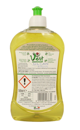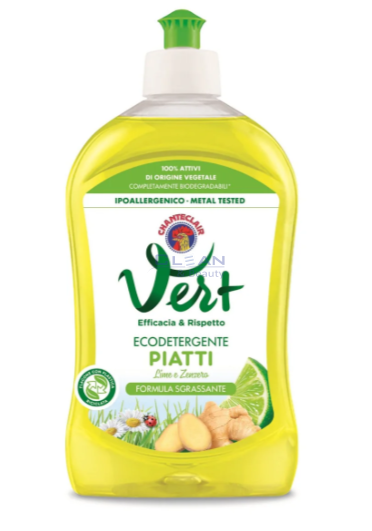 CHANTECLAIR Vert Piatti Lime e Zenzero 500 мл е препарат за ръчно миене на съдове с формула на растителна основа, създаден за ефективно отстраняване на мазнини и замърсявания. Съчетава свежестта на лайм и пикантните нотки на джинджифил, които неутрализират неприятните миризми и оставят съдовете блестящо чисти. Формулата е биоразградима и по-щадяща към кожата при нормална употреба, което го прави подходящ за ежедневно миене на чинии, чаши, прибори и тенджери. Част от екологичната линия Vert, продуктът е разработен с грижа към околната среда и е популярен избор в Италия и Западна Европа.