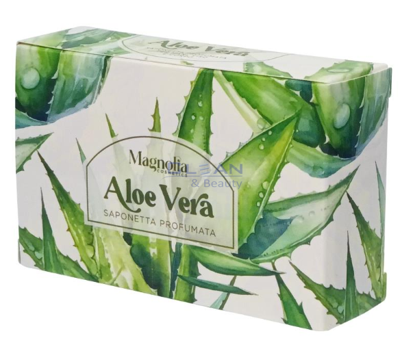 MAGNOLIA САПУН ALOE VERA 115 г е класически тоалетен сапун, създаден за деликатно почистване и подхранване на кожата. Формулата с алое вера спомага за хидратацията и успокояването, като оставя усещане за мекота и свежест след всяко измиване. Подходящ е за ръце и тяло, както и за ежедневна употреба от цялото семейство. Кремообразната пяна почиства ефективно, без да изсушава кожата. Произведен в Италия и предназначен за европейския пазар, сапунът съчетава традиция и грижа в едно.
