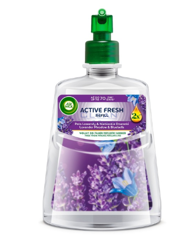 AIR WICK Active Fresh Поля Лавандула е ароматен пълнител за автоматични освежители за въздух, който съчетава технология за неутрализиране на миризми с естествено вдъхновен аромат на лавандула. Формулата е създадена с натурални етерични масла и ефективно освежава въздуха в дома, като премахва неприятни миризми от кухня, баня или дневна. Пълнителят е съвместим с автоматичните дифузери Air Wick и осигурява дълготрайна свежест в помещението. Ароматът на лавандулови полета създава релаксираща и уютна атмосфера, характерна за популярните освежители в домакинствата в Западна Европа.