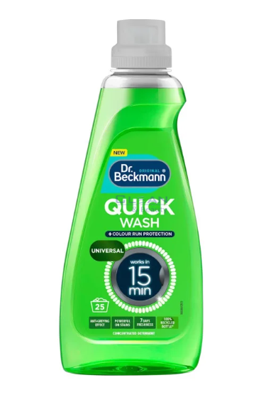 DR. BECKMANN Бърз перилен препарат 800 мл е специално разработен за кратки програми на пералнята, осигурявайки ефективно почистване само за 15 минути. Универсалната му формула е подходяща както за бели, така и за цветни дрехи, като премахва ежедневни замърсявания и неприятни миризми, без да уврежда тъканите. Благодарение на концентрирания си състав препаратът осигурява до 25 пранета и е ефективен при ниски температури. Подходящ за всички автоматични перални машини и идеален за модерните домакинства в Европа, които търсят бързо и ефективно пране. При пране на ниска температура се пести енергия и се запазват цветовете и тъканите.